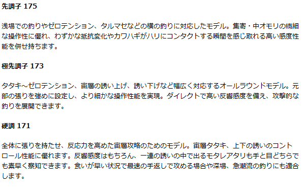 ■先調子 175浅場での釣りやゼロテンション、タルマセなどの横の釣りに対応したモデル。